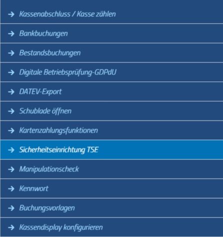 - Öffnen Sie (an einem Arbeitsplatz an dem Kassiervorgänge möglich sind) im Menü KASSENMANAGER den Punkt Sicherheitseinrichtung TSE.